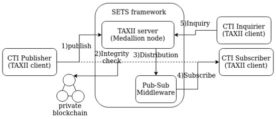 - Admission: Upon reception of a CTI object, the SETS framework first ensures that the information has not been published before. Then it retrieves the respective hash from the private blockchain using the information’s metadata . Next, it computes the hash of CTI with the use of and checks against the hash value from the blockchain. The SETS framework stores the tuple in the database after the successful integrity check i.e., if .