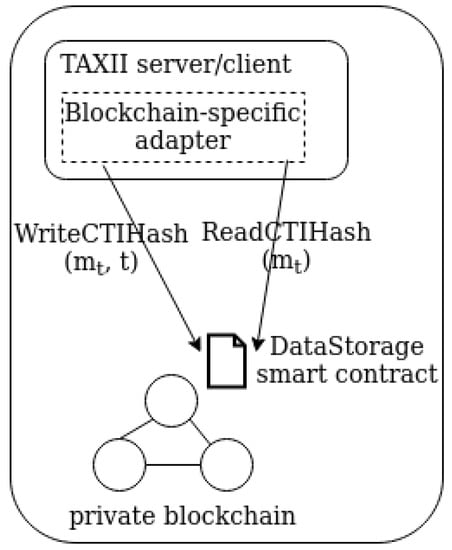 During the initialisation phase, each adapter establishes a connection between the TAXII components and the respective blockchain. Afterwards, the adapter, based on the operations requested by the component, would trigger varying transactions on the corresponding blockchain. To launch a transaction, the adapter invokes one of the functions that are defined in the DataStorage smart contract.
