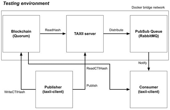 This section details the prototype implementing the design described above. This prototype is built on top of the official implementation of TAXII 2.1 standard which is publicly available at OASIS TC open repository [41,42], Hyperledger Fabric and Quorum as private permissioned blockchains. As illustrated in Figure 2, the prototype is composed of four key components: TAXII client, TAXII server (i.e., Medallion node), pub-sub middleware and private blockchain.