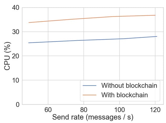 Our quantitative performance analysis reveals that the addition of a blockchain in the consumption process increases latency by an average of s and reduces throughput by messages per second. The performance is constant no matter the input send rate, at a message consumption success rate of over , showing that the bottleneck is not due to the load. Combined with the fact that the throughput in the baseline implementation, without a blockchain, is capped at 10 messages per second, which is 5 to 13 times lower than the input send rate, we can be confident when saying that the baseline SETS framework (which is the official TAXII server with a minimally viable implementation) needs to be improved for a much higher event processing rate, before reassessing other features added to the system. The resource utilisation of the sharing framework increases when adding blockchain for integrity, but the increase is an acceptable margin. We conclude that our solution has a stable performance and success rate, while the major performance loss incurs in the baseline implementation of the TAXII server which has the potential to be improved.