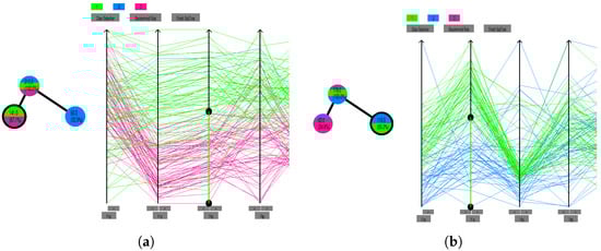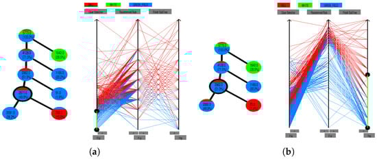 So far, we have shown how our HITL-ML system uses parallel coordinates to effectively assist a user in the interactive learning phase of constructing a DTC. We now demonstrate how we can also use parallel coordinates to allow a user to understand a particular classification made by a learnt DTC. Our approach here supports explorative data mining, where experts are seeking to find characteristic rules or discriminant rules []. One of the features of DTCs is their ability to be converted into a decision list. Such a decision list is composed of a series of if–else rules that can be followed to determine the classification of a particular instance. We use a similar idea to visualise the decision path for a single leaf in a DTC. Instead of a textual representation of such a rule, however, we can again use parallel coordinates to graphically represent this decision path. We argue that parallel coordinates are ideally suited to this task, as we can use a series of axes to visualise each component of the rule in the one visualisation. Depending on the depth of the rule and available screen real estate, we may even be able to visualise the entire decision path on one screen. Not only this, but in our graphical representation, we can visualise the training data and the effect that each component of the decision path has on the resulting subset of selected data. When used in conjunction with our visualisation of the entire DTC and its accompanying statistics for each node, we argue that this gives a human user a profound, intuitive and interpretable explanation of a DTC’s classification.