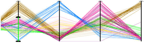 - Inselberg, A. III.14 Parallel Coordinates: Visualization, Exploration and Classification of High-Dimensional Data. In Handbook of Data Visualization; Springer: Berlin/Heidelberg, Germany, 2008. [Google Scholar] [CrossRef]