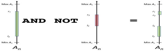 The splits the user can apply were defined in our earlier work []. A split on one axis alone is commonly a range, and this is familiar to DTC construction as this is also the type of split evaluated by algorithms such as C4.5 [] or J48 []. However, the parallel-coordinates visualisation allows an oblique split [,,] that involves two attributes. Thus, the oblique test is interpretable particularly because of the point-line duality in parallel coordinates []. For instance, a rule that uses a point between two attributes in parallel coordinates means that instances in this split follow two types: first, those that closely follow some linear correlation between two attributes, and second, those that do not reflect such a linear correlation. If we use a rectangular region for the split, then we regulate a margin for the above-mentioned linear correlation. Figure 2 illustrates the types of splits users can introduce in our system.
