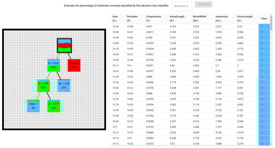 On the left of the screen, the system presents a visualisation of a DTC to both groups of participants (there is no difference in this aspect for Group A and Group B). The right half of the screen shows a table containing the training data used to learn the DTC. This table also has a colour coding for the class column for both Group A and Group B. For participants in Group B, the nodes of the DTC are also coloured. For each tree, participants are first asked to estimate the accuracy of the tree by entering an integer between 0 and 100. Using accuracy rather than the F-measure ensured that all participants were familiar with the statistic used. Given that accuracy is a much simpler statistic to calculate than F-measure, asking for accuracy also ensures that the cognitive load on the participant is reduced as much as possible.
