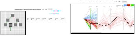 The first experiment examines the effectiveness of visualising a DTC using a node-link diagram with coloured nodes (see Figure 1). The second experiment examines participants’ ability to understand the classification of individual instances, comparing the traditional method of traversal of a DTC against the PC-based visualisation of the path to a leaf node. In the third experiment, pairs of videos are played to the participants, contrasting two different HITL-ML systems. Showing videos removes the participants’ need to gain sufficient expertise with GUI aspects that are not the core of the visualisation. Nevertheless, participants can evaluate how well a system supports the user to perform a HITL-ML task.