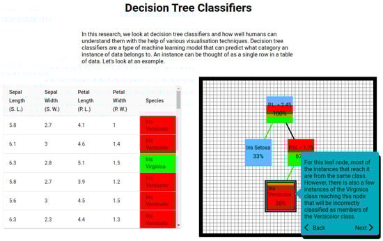 The online survey consists of three different experiments and offers participants user interaction as if they were performing tasks in a system for HITL-ML. Not only does the system display videos and allow users to click on images to experiment, while moving forward and back through explanations, it also enables interactivity in all components when building DTC, including display, the selection of nodes, and their expansion. In addition, the system allows users to configure some parameters of these visualisations.