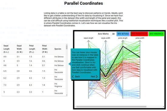 Earlier [], we incorporated HITL-ML and used visualisation with parallel coordinates [] to interactively build accurate and interpretable models with explainable outputs. We reviewed earlier evaluations of HITL-ML in machine learning tasks []. In particular, we provided an in-depth evaluation [] of the WEKA [] package for IML. Since the three fundamental aspects of IML are users, data, and interface [], in this paper, we turn our attention to the interface and evaluate it with users who could play the primary roles of data scientists (but not domain experts) []. We have now incorporated parallel coordinates for the exploration of datasets and HITL-ML into a software prototype for the deployment of decision-tree classifiers (DTCs).