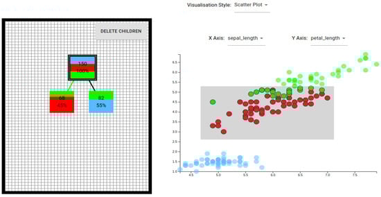 As opposed to the earlier proposals, some empirical evaluation is reported in WEKA’s UserClassifier []. UserClassifier is an IML system for DTCs that shows a scatter plot of only two attributes at a time (the user can pivot which two attributes appear in the visualisation). A display of small bars for each attribute provides some assistance for attribute relevance. The attribute bar presents the distribution of classes when sorted by that attribute. The user can review the current tree as a node-link diagram in one display, select, and expand a node. WEKA’s UserClassifier is the only one reporting usability studies, and it involved only five participants []. Later, it was evaluated with 50 university students who had completed 7 weeks of material on machine learning and DTCs []. This study confirmed a number of limitations of WEKA’s UserClassifier. For instance, the type of interaction (on the dataset and on the model) are restrictive in a number of ways.