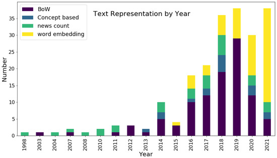 Figure 2 depicts the distribution of published papers in terms of years and text representation approaches that they investigated. The growing number of papers in recent years shows the importance of applied studies in the intersection of behavioral finance and artificial intelligence. This figure clearly shows the investigation of text mining methods after 2006 in the reviewed literature and the increasing number of embedding techniques used in the literature over the past two years. We explore papers published in prestigious journals and conferences by searching for keywords such as “financial market prediction”, “financial sentiment analysis”, “news text mining”. We select papers that contribute to the intersection of behavioral finance and financial newsgroups and social media analysis. Table 1 depicts the most cited related works published in journals and conferences. The citation statistics were extracted from Google Scholar as of 10 September 2022. Most journals do not have commercial or advertiser relationships, while some conferences are sponsored by financial companies and stakeholders. The Expert Systems and Applications, with 14 publications, has the greatest number of related publications among other sources, and the Association for Computational Linguistics (ACL) conference with 4 publications has the most papers among other conferences. Bollen et al. [55], who proposed stock market mood estimation, from Twitter, have the most cited work since 2010.