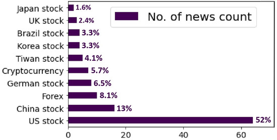Applied studies that we reviewed in this work mainly used various information sources, including market- and media-based sources. Figure 3 depicts the distribution of market based on corresponding countries. Refs. [10,88,91,105] examined the predictability of US stock market, including Dow Jones, NYSE, and S&P 500 stocks. Refs. [15,21,60,95,96,106] have studied the predictability of the Foreign Stock Exchange (Forex) and cryptocurrencies market, where a currency is traded based on the ratio of two currency pairs, such as the EUR/USD, UDS/JPY, or BTC/USD. News [13,86,89,107]; social network data, such as Twitter [55,108,109], Stocktweet [88,108,110], or Sina Weibo [111]; as well as trends in search engines [95,112]; referring to Wikipedia page statistics [59]; and online reviews of customers about firm’s products [113] are the types of media-based sources available to investors.