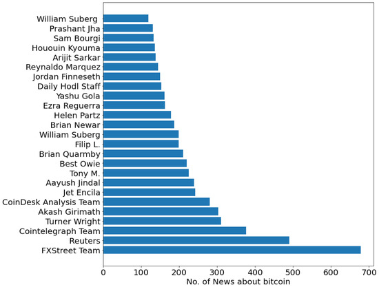 Thomson Reuters and Bloomberg newsgroup are the mainstream news resources in this category; however, it is a basic challenge to utilize relevant texts to the target market because of redundancy and noise in the associated texts. Most of the review papers have manually selected the target market-related news based on manually predefined rules [15,60,114]; however, there are some researchers that proposed a method for selecting the stock-related news, including summarizing the news, measuring the news information gain analysis, and knowledge graph techniques [21,39,67,115]. Farimani et al. [12,16] explored 12 specialized newsgroups that specifically publish for Forex, cryptocurrencies, and commodities and select relevant news to the target market based on judgments of specialized authors. They made public RESTFul APIs (https://robonews.robofa.cscloud.ir/Robonews/v1/, accessed on 2 December 2021) and MarketNews (https://figshare.com/articles/dataset/MarketData_for_MarketPredict_RESTFul_API_including_News_and_Market_Data/14754966, accessed on 21 September 2018) datasets so that the research community can access these news sources. For example, Figure 4 presents the number of news indicated for Bitcoin via 25 specialized authors among 592 authors in Cryptocurrency category of MarketNews dataset.