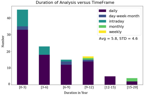 A broad variety of predictive models have analyzed diverse portfolios [125,126,127,128] with an average of 5 years duration. Figure 5 depicts the duration of analysis in reviewed articles in the year. For example, bar ‘0–3’ shows the number of methods with less than three years of duration of the analysis stacked based on the trading timeframe that the scholars focused on. There are two mainstream predictive methods. One predicts the real value of price based on regression models and the other uses a classifier for predicting the trend direction. Researchers have studied the change in the close price and have examined the different duration of time for analyzing the impact of news on the market for short term (minutes to a day) or long term (weekly to monthly). The latter are those [18,36,79,122] that focused on trend (up/down) prediction and formulated the problem as the binary or multiclass classification that was determined based on the change in close price due to two consequent time frames. In terms of news labeling, a few methods labeled news by considering asymmetric time intervals before and after news publishing. For example, Chen et al. [21] analyzed the influence of input time and prediction time on Forex trading in an asymmetric manner. They labeled news based on the change in close price within t1 minutes before news input timestamp and t2 minutes after news announcement.