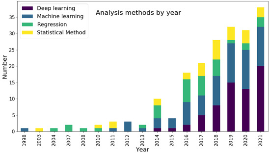 Different methods have adopted different data types. Some works on predicting stock markets only use text information from daily news [19,39,61,99,101], while others [18,25,34,124] consider a combination of textual and market-based features. Traditional models split data into train and test in chronological order for model training, while in the recursive model, training in rolling window strategy is used. In the rolling window training strategy, dynamic updating of the model parameters is investigated with respect to structural change in market, whereas in traditional train and test split, the training process is static. In some cases [23,28,61,91,129], cross-validation is used for evaluating the accuracy of prediction. Figure 6 shows the distribution of predictive models in the reviewed methods by publication year categorized into 4 groups of deep learning, machine learning, price regression, and statistical analysis of inter-dependencies between media and price fluctuations.