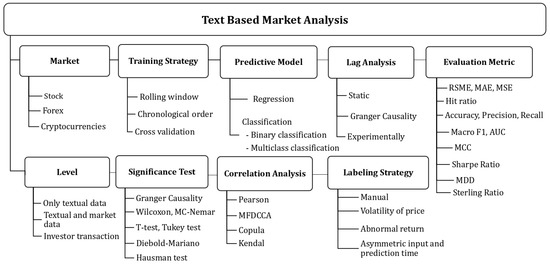 In this section, we investigate a text-based market analysis and discuss issues from three viewpoints: predictive models, the statistical analysis of stakeholders’ behavior, and recommendations for portfolio selection. Figure 7 depicts the taxonomy of traits researchers considered while designing their market analysis models. Some aspects in Figure 7 were explained in the background section and here we discuss the other characteristics.