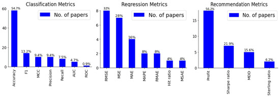 Evaluation Metrics. Accuracy, precision, and recall are three common metrics for evaluating the classifier for trend prediction (up/down classes). In the case of an unbalanced dataset due to an up or down trend in the market volatility regime, the weighted Macro F1, Area Under Curve (AUC), Receiver Operating Characteristic (ROC), and Matthews Correlation Coefficient (MCC) are more reliable metrics. The RMSE, MSE, MAE, and hit ratio are traditional metrics for the residual evaluation of regression-based predictive models. Some predictive models proposed a trading strategy and evaluated the effectiveness of such models based on profitability and investment metrics, such as the cumulative profit, Sharpe ratio, and Maximum Drawdown (MDD). In Section 3.3.3, we discuss these metrics and methods. Figure 8 depicts the distribution of the evaluation metrics used in publications, which shows about 60 papers focused on the trend prediction evaluation with an accuracy metric. Moreover, most predictive methods consider the trend (up/down) prediction and are less focused on price regression.