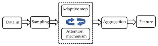 The model first samples the neighbors of the central node, adds the obtained neighboring nodes to the attention coefficients, and then assigns different weights to them during the aggregation process. After the aggregation is completed, the adaptive propagation stopper of the central node determines whether the next convolution operation is required; if not, the final feature representation of the node is derived. In Figure 1, and represent the features of the central node’s neighbors after the aggregation function, and the dashed lines indicate the node connections that were not sampled. More details are described in Figure 2. The adaptive propagation graph convolutional network, based on the attention mechanism proposed in this paper, has the following three contributions: