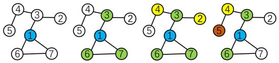 The picture shows the propagation process of a node. In the first step, node 1 propagates one step and finds 3, 6, and 7. In the second step, it propagates two steps and finds 4 and 2. In the third step, it propagates three steps. Then, 5 is found, but, at this time, the adaptive stop propagator of nodes 2 and 7 stops the propagation of nodes 2 and 7, so the features of these two nodes should be removed in this step.