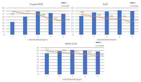 It can be seen from the results that in the graph-SAGE and GAT models, when the number of neural network layers increases, the node feature representation becomes more and more similar, and the model effect begins to decline. This result verifies that the effect of the existing graph neural network model degrades, due to over-smoothing problems, when the number of layers increases. In APAT-GCN, the oversized problem is mitigated, suggesting that the model’s sampling and aggregation methods are, indeed, effective.