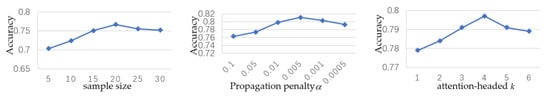 The graph-SAGE model uses to confirm the propagation range and to determine the number of samples of the ith-order neighbors. We use the configuration of the original text, = 2, , so that the center node can get the information of the second-order neighbor at most. The AP-GCN model uses the propagation penalty parameter to dynamically adjust the range of propagation and sets the maximum number of propagation steps to 10. GAT mainly adjusts the degree of aggregation of node information by setting the attention head, but the attention head is too large. It is not only slower in training, but also causes overfitting.
