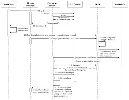 Data owners, data inquirers, and SMPC nodes need to register with the SMPC contract before the calculation begins. Participants (SMPC nodes or users) pay a deposit to the SMPC contract, and the SMPC contract returns a unique ID to the registrant. The data inquirers send their public keys to the SMPC contract, which generates the proxy re-encryption key. The computation function in the contract is agreed upon in advance by the participants of the secure multi-party calculation so that the code can be written and deployed on the blockchain platform to automatically trigger the execution of the agreed computation without human intervention.