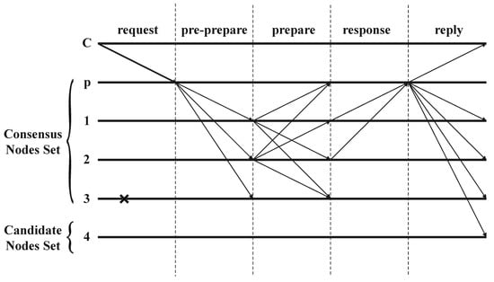 The SG-PBFT renumbers and adjusts nodes after each agreement is reached. This ensures that the identity of the primary node is hidden and therefore resistant to distributed denial of service (DDoS) attacks. In the SG-PBFT, even if all malicious nodes join together, they can only send no more than 1/3 of the total number of messages. Malicious nodes cannot reach a consensus, therefore the SG-PBFT can resist selective attacks. The SG-PBFT operating process is shown in Figure 3. The “x” on the line indicates that the node is a failed node.