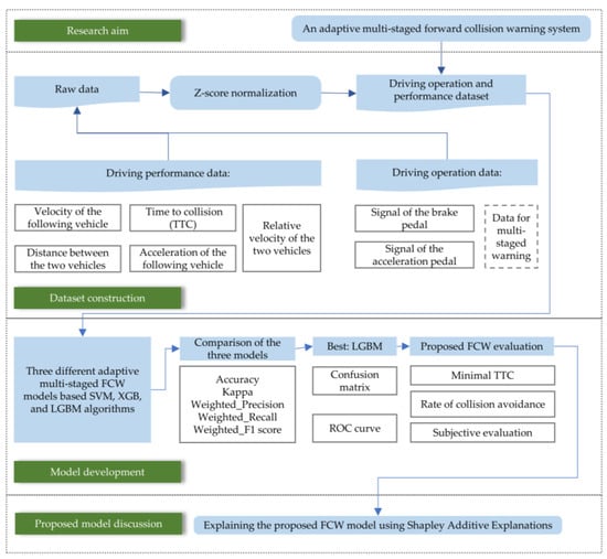 As shown in Figure 1, the general framework of this study consists of four parts: research aim, dataset construction, model development, and proposed model discussion. In this study, a driving characteristics acquisition test and FCW validation test were conducted. The aim of the driving characteristics acquisition test was to train and test the proposed FCW model. The driving operation data were collected to build a two-staged warning model according to the urgency of the impending collision. The objective of the FCW validation test was to evaluate the proposed FCW model. Simulation experiments were conducted for the above tests.