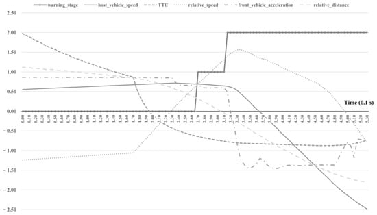 Figure 3 demonstrates the data of one triggered FCW sample. The start of the timing is when FCW is triggered by the front vehicle, and the end is the moment when TTC first increases to 3 s. TTC = 3 s is often used as the minimum FCW threshold [32,33]. Accordingly, we assume that when TTC increases again to 3 s, it indicates the end of the FCW event. For the target variable, zero is no warning stage, one indicates the first stage of warning, and two is the second stage of warning. All the predictor variables were standardized using z-score normalization.