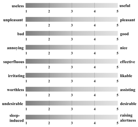 In the FCW validation test, we focused on evaluating the proposed model and then comparing it with other FCW models. For objective evaluation, minimal TTC and rate of collision avoidance were used, as these two metrics offer an effective way to evaluate the utility of FCW models [10,12,34,35]. Minimal TTC represents the average of the minimal TTC in all samples of the FCW validation test. The rate of collision avoidance represents the percentage of successful collision avoidance in all samples of a particular FCW model. In addition to objective indicators, subjective evaluation was also adopted to assess the proposed model. A subjective timing assessment is recognized as a useful measure to analyze the adaptability of FCW models [11,36]. The rating scales of FCW trigger timing were modified from Winkler’s paper [11]. In addition, the assessment of the driver’s acceptance of the model was performed based on the acceptance rating system of Van Der Laan (Figure 4) [37]. The above metrics were compared among staged TTC [33], Honda [18], Mazda [5], and the proposed model.