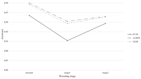 Figure 5 listed the comparison of the recognition accuracies of the different FCW models. LGBM had the highest prediction accuracy for the three warning stages. For the overall classification performance, LGBM and XGB were similar in accuracy, and the difference was not significant, but both were more accurate than the SVM model. As the first stage had the smallest number of samples, the prediction accuracy for it was lower than in the other two stages.