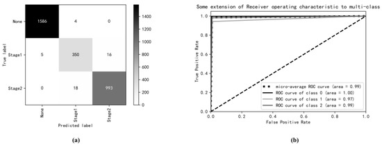 Figure 6a shows the validation results of the LGBM model using the confusion matrix based on the result of the LGBM’s prediction of the acquired data. Moreover, the receiver operating characteristic (ROC) curve is demonstrated in Figure 6b. As can be seen in the figure, the results indicate that the proposed model was successfully validated, since the area under curve (AUC) of the micro-average ROC curve was estimated as 0.989.