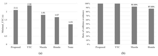 After a defined emergency braking event of the front vehicle, the driver in the following vehicle brakes to avoid a rear-end collision. During the above process, a minimal TTC will exist. Figure 7a shows the comparison of minimal TTC. The staged TTC model had the biggest minimal TTC, followed by the proposed model. Though the Honda model had the lowest mean minimal TTC among the four models, its mean minimal TTC was still higher than that of the baseline. As shown in Figure 7b, the proposed and staged TTC model helped the participants avoid all the collisions, whereas the Honda model had the smallest collision avoidance rate.