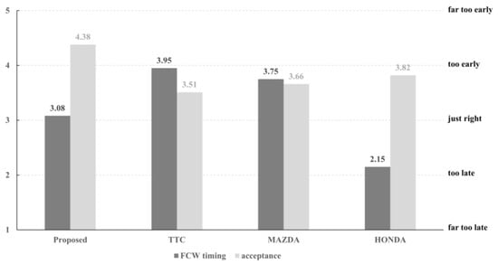 As shown in Figure 8, we used the participants’ subjective evaluations of the four FCW models in the validation test. The proposed model had the most appropriate timing among the four models. The timing of the staged TTC model and that of the Mazda model were considered by the participants to be slightly earlier, whereas the timing of the warning from the Honda algorithm was considered late. For user acceptance, the proposed model had the highest acceptance rate, whereas the rate of the staged TTC model was the lowest.