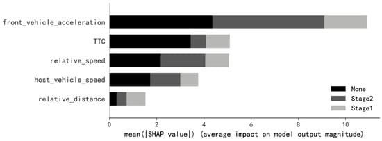 As previously mentioned, the LGBM is an ensemble learning algorithm, but is difficult to explain, being like a black box. However, the relationship between the model’s output and features (five predictor variables) can be analyzed and then explained by Shapley Additive Explanations (SHAPs). The SHAP value is the average marginal contribution of a feature value across all possible coalitions [40]. Figure 9 demonstrates the average contributions of the predictor variables to the output of the model. Among all features, the front vehicle acceleration had the largest contribution, whereas the distance between the two vehicles had the smallest contribution to the classification. For the no-warning stage, the front vehicle acceleration and TTC are the two significant features. Concerning the second warning stage, the front vehicle acceleration and relative velocity are the two features that mainly affect the characteristics. Surprisingly, the presence of the two features, the delta velocity and TTC, can help distinguish between these two stages. As mentioned before, although the distance between the two vehicles was the feature with the least contribution, this feature was able to distinguish the first warning stage from the other two stages. In summary, the contributions of the features to the classification results make the FCW algorithm interpretable and justify the selected feature metrics as well.