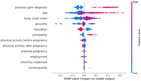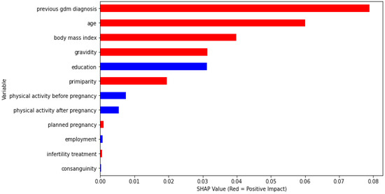 The impact of each feature towards GDM diagnosis is represented in Figure 2. The figure shows that based on higher SHAP values, previous GDM diagnosis is the most important factor for GDM diagnosis in the current pregnancy compared to any other feature. Maternal age and BMI are the next most important factors in GDM diagnosis. Features such as self-reported physical activity before and after pregnancy, employment, infertility treatment, and planned pregnancy had very little impact on GDM diagnosis. Again, previous GDM diagnosis was identified as the most important feature, and maternal age and BMI were the second most predictive features contributing positively towards GDM diagnosis using the SHAP values. On the other hand, self-reported physical activity before and after pregnancy and higher education have a negative impact on the proposed GDM model.
