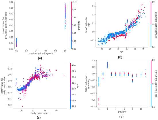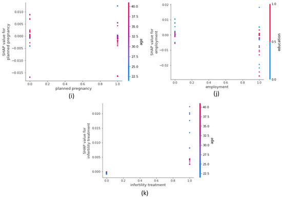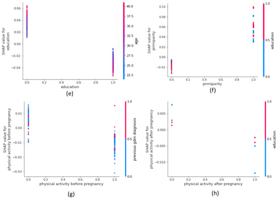 Figure 4 represents the dependence plot for the features using the SHAP values for each sample. The plot shows that previous GDM diagnosis has a clear interaction with gravidity, as shown in Figure 4a for women who have been previously diagnosed with GDM and those who have a gravidity more than four. In this situation, the SHAP values increase and thus the women are at a higher risk of developing GDM. For age (Figure 4b), the SHAP value increases when the age of the women is older than 35 years. Regardless of previous GDM diagnosis, increased age is a risk of developing GDM. Nevertheless, we also found that pregnant women whose age is less than 30 years are negatively impacted in the GDM model. BMI (Figure 4c) shows an interaction with age, that is, a pregnant woman whose BMI is more than 30 kg/m2 (considered obese) has an increased risk of GDM, especially in older women. Younger pregnant women with a BMI less than 25 kg/m2 (considered of acceptable weight) are negatively correlated with GDM diagnosis. The plot also shows that gravidity increases the risk of developing GDM. Women with lower education (Figure 4e) are at a higher risk of developing GDM, especially if they are older women. Primiparity has an interaction with education, as shown in Figure 4f, which shows that women who attend higher education and who are not primiparous are at a lower risk of developing GDM. Physical activity before pregnancy (Figure 4g) shows an interaction with previous GDM. Women who do not perform physical activity, on the other hand, have >0 SHAP values, indicating a risk of GDM diagnosis. In Figure 4i, it is shown that unplanned pregnancy in older women is a risk for developing GDM diagnosis. Employment and education have an interaction, which show that women who are unemployed with lower education may be at a higher risk of GDM diagnosis (Figure 4j). The dependence plot for infertility treatment in Figure 4k shows that younger women who had infertility treatment are at a higher risk of GDM diagnosis.