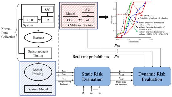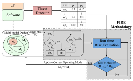 Figure 2 depicts the software architectural overview of the threat detection and estimation system with the finely integrated risk evaluation system as conceptualized by our framework. We assume that the life-critical system has an on-chip threat detector and estimator, as in [9,26], and its software is designed in a multimodal approach as discussed in the research works [10,11]. We summarize the details of one such on-chip threat detector and estimator and multimodal design as follows: