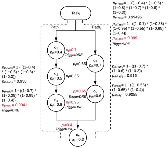 where pthPi for Pi = { oi|i = 0,..,m } is the path threshold beyond which the execution path is compromised and is defined as the probability that at least one operation in the execution path sequence is compromised, and ptPi is the real-time estimated threat probability of the path. An annotated illustration of the calculations as per POT, PPT, and PPT is shown in Figure 4.
