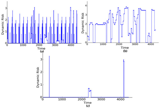 Analysis: The corresponding risks and successive static risk thresholds at the operating mode level are calculated as in Section 5. We evaluate the three DRE filter condition thresholds by running a normal execution trace of the insulin pump and calculating the dynamic real-time risks as in Equations (5)–(7). Under ideal normal operating conditions, DRE should not be executed (0% execution rate), as the real-time probability of an operation will always be less that the security risk threshold (i.e., RM1 = 0). The experimental results of utilizing POT, PTT, and PPT for a normal execution trace are shown in Figure 5, and the DRE execution rates are shown in in Table 2. The execution rates shown in Table 2 are attributed to the false-positive rate from the threat detector during normal operation, which has been shown to be up to 3.25% [26]. The dynamic risk evaluation in FIRE effectively assesses that the threat detector’s false positives from normal execution do not need mode switching mitigation. As shown, the PPT condition performs the best, with a 5.85% DRE execution rate, while the PTT condition performs the worst, with a 39% DRE execution rate. PTT has the worst performance because it accumulates the false positives of all its composing operations. By dividing the software tasks to individual execution paths, the execution rate is considerably reduced, as the false positives are isolated to their respective execution path, considering the behavior of the path.
