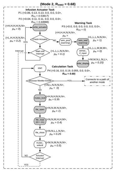 We calculated the static risk threat thresholds for all modes of the insulin pump during design. A sample annotated HCFR graph of M2 of the multimodal insulin pump is illustrated in Figure 8. Mode 2 consists of three tasks (warning, calculation, and infusion actuator) and four paths. We take the example of the calculation task in M2 to demonstrate the assignment of the CIA values and the calculation of the effective static risk. The calculation task has six operations, namely check_glucose_monitor, lock_mutex, open_file, read_file, close_file, and unlock_mutex. Each of these operations were assigned CIA values based on their impacts on health and data sensitivity. check_glucose_monitor was assigned <N,L,N,N,N,N>, lock_mutex was assigned <H,N,H,N,N,N>, open_file was assigned <N,N,M,N,N,M>, read_file was assigned <N,N,M,H,H,M>, close_file was assigned <N,N,L,L,N,N>, and unlock_mutex was assigned <M,N,M,N,N,N>. The CIA health values for lock_mutex are <H,N,H>, representing that a loss of confidentiality of the operation has a high impact on the health of the patient (H), a loss of integrity has no impact on health (N), and a loss of availability results in a critical impact on patient health (H). The CIA data sensitivity values for the same operation are <N,N,N>, representing that losses of confidentiality, integrity, and availability have no impact on the data sensitivity. However, for read_file the CIA data sensitivity values are <H,H,M> because losses of confidentiality and integrity lead to critical impacts on privacy while a loss of availability leads to a reasonable impact (M). The probability threat thresholds of these operations are provided by the threat detector and are shown in Figure 8. The CIA values are assigned scores as in Table 1. Based on the CIA security values for health and data sensitivity, the scaling factor in (3) is 1.667 as:
