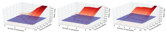 Surface plots of the analysis for M1, M2, and M3 of the insulin pump are illustrated in Figure 9. The static risk thresholds for these three modes are {RthM1 = 0.68, RthM2 = 0.68, and RthM3 = 0.958}. In this case study, the thresholds for the three modes are the same, as they were computed as the maximum of their composing tasks/paths (as in Equation (4)). The highlighted heat map surface area represents the number of operations and the corresponding threat probabilities at which the risk of the mode is beyond its static threat threshold and would require risk management by mode switching. The extreme red region of the heat map shows the worst-case scenario where all the operations of the mode have been affected by a security threat with the maximum threat probability.