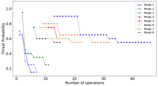 Mode risk boundary lines of all insulin pump modes. Graph of number of operations vs. threat probability shows the threshold conditions.