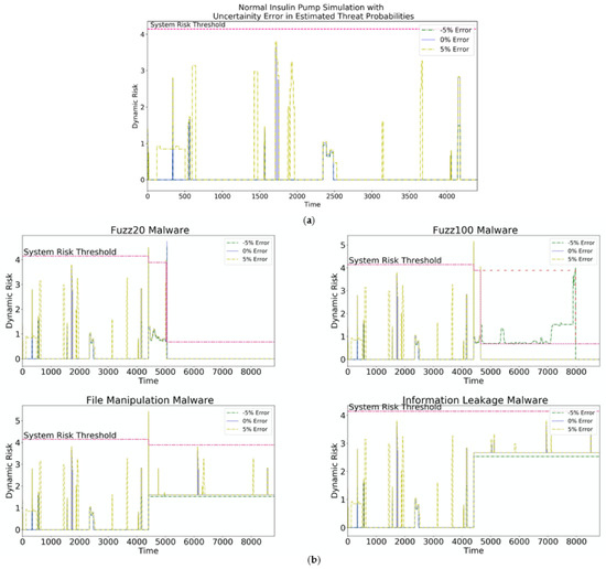 Simulation results plotting the insulin pump dynamic risk vs. execution time for +/−5% error in estimated threat probabilities for: (a) normal execution and (b) compromised execution with real malware.