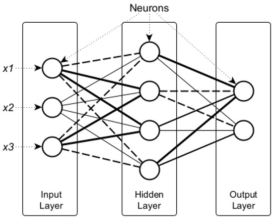 Multi-layered perceptron (MLP) is a type of ANN architecture that consists of fully connected neurons in feed-forward networks. Due to its robustness and performance, MLP is one of the most commonly used ANN architectures, either for research or practical purposes [36]. Figure 2 shows the example of ANN with MLP architecture with one input layer, one hidden layer, and one output layer. In the network, the diagram in Figure 2 depicts the lines representing the weight value. The thicker the line, the greater the weight value. The solid line depicts the positive weight value, while the dashed line depicts the negative value of the weight.