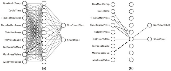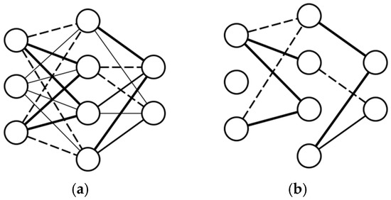 As learning progresses, the impact of initial connection weights also decreases. From Equation (7) it can be seen that for each connection it will lose weight each time the weight changes by the same amount of . Therefore, the word “forget” is used. Due to the forgetting process, the resulting network contains only the connections that significantly affect the final calculation of the output layer in the ANN architecture. Visually the difference between the regular network generated through backpropagation training and the trimmed network using the SLF technique are consecutively shown in Figure 3a,b below. From Figure 3b, we can roughly conclude that the ANN model produced by SLF training has a simpler representation.