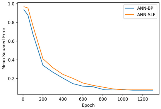 The mean squared error of ANN training using backpropagation and SLF.