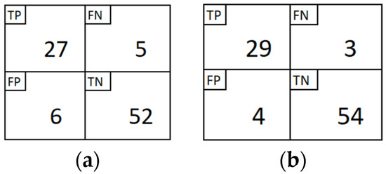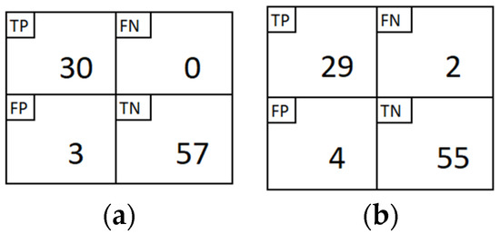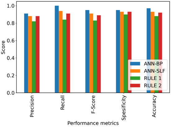 To assess the validity of the proposed approach, the performance evaluation of the two ANN models was furtherly compared. The evaluation criteria previously outlined in Section 2.4 were applied to both models. For evaluation purposes, the models were run to predict the test dataset which consists of 90 data. The first performance comparison is the confusion matrix as depicted in Figure 7. From Figure 7, we can see that there is no significant distinction between the confusion matrix of the ANN model trained with the backpropagation algorithm (see Figure 7a) and the ANN model trained with the SLF approach (see Figure 7b). The ANN model trained with the SLF algorithm made 6 errors (FP + FN) out of 90 predictions.