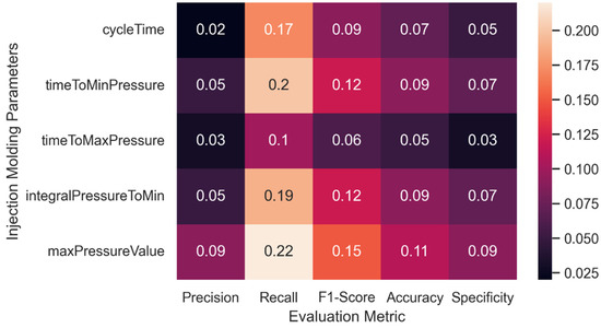 To give additional insight, we provide the relative importance of each extracted parameter by SLF to the final prediction output in Figure 10. Figure 10 depicts how much the dismissal of each parameter from the initial ANN would decrease the model performance on each evaluation metric. For instance, the dismissal of the parameter “maxPressureValue” would decrease the model performance by around 0.22% or 22% from the “Recall” measurement.