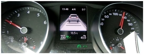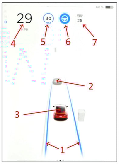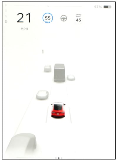 In this study, HMI designs from BMW (Bayerische Motoren Werke AG, Germany) 3 Series, Tesla (Tesla, Inc, Austin, TX, USA.) Model 3 and VW (Volkswagen AG, Germany) Passat were employed. The HMI images used were from the driver’s perspective, where the instrument clusters were shown for the images of BMW and VW, while the touchscreen next to the driver was used for Tesla’s images. The HMI designs on the market were chosen for their distinct design concept, where VW keeps the traditional layout (i.e., speedometer and tachometer) and puts system status on the bottom with relatively smaller icons (Figure 1). On the other hand, Tesla provides detailed information for ego and surrounding vehicles and takes traditional meters away (Figure 2). The HMI design for BMW combines the above two (Figure 3). Furthermore, using existing HMIs could make the results of this study a valuable foundation for future studies concerning various user experiences and mental models of different HMI designs.