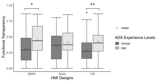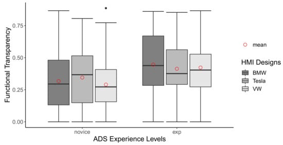 The results using the proposed transparency assessment method did not confirm Hypothesis 1a, but support Hypothesis 1b. During the verification test of the transparency assessment method, no significant difference was found among the three different HMI designs. This could be explained by the generally low FTs measured, suggesting that participants had difficulties understanding these three HMI designs. When the proposed method is properly utilized and incorporated into the HMI design process, we could then more efficiently develop a more understandable HMI design and overcome this problem. For instance, critical elements that help increase HMI understandability could be efficiently identified by observing what information users with high FT use to understand it. And the opposite could also be done to identify potentially misleading information. On the other hand, the effect of ADS experience levels on FT was found significant and was significantly more prominent in the HMI designs of BMW and VW. The result supports Hypothesis 1b and establishes internal validity. This significant gap in understanding the HMI designs between experienced and novice users also suggests that human drivers require some levels of training to understand the HMI [,,]. Apart from general ADS experience, it might also be interesting to look into how a specific brand’s experience interacts with the HMI designs of some other brands on the FT. In the feedback section of the survey, some participants mentioned that they made specific suggestions based on their experiences in L2 AV. Since the design, icons, and logic behind the HMI designs are different, further studies investigating such interaction could be valuable in the future.