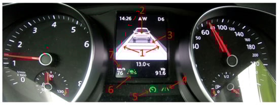 In all HMI designs, lane marking detection was indicated by icon #1 (Figure 6, Figure 7 and Figure 8), and additional icons were used on VW’s design (#4 and #6 in Figure 8). The effect of FT level was not significant, , and was the same for HMI designs, , and for the interaction as well, .